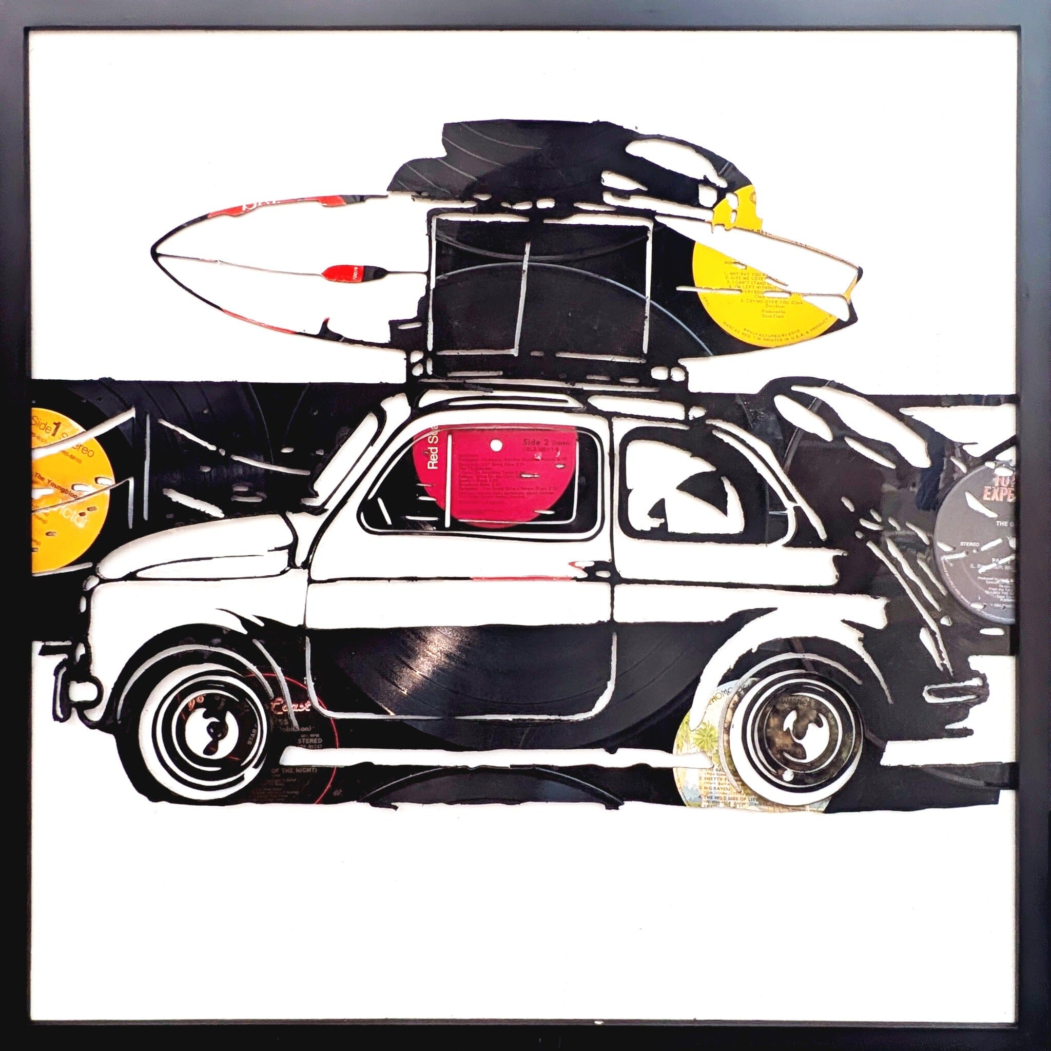 Board Certified is a 24″ × 24″ mixed-media collage carved from nine vintage vinyl records and other found objects. A tiny car loaded with surfboards becomes a playful symbol of freedom and adventure, blending travel imagery with surf culture. Each record was chosen for its lyrical or thematic connection to the idea of hitting the road — from surf rock to road-trip anthems. Hand-cut and polished, the vinyl pieces are layered on a pure white background to create striking contrast. This one-of-a-kind artwork invites viewers to imagine setting off on an endless road trip with their favorite tunes and board strapped to the roof.